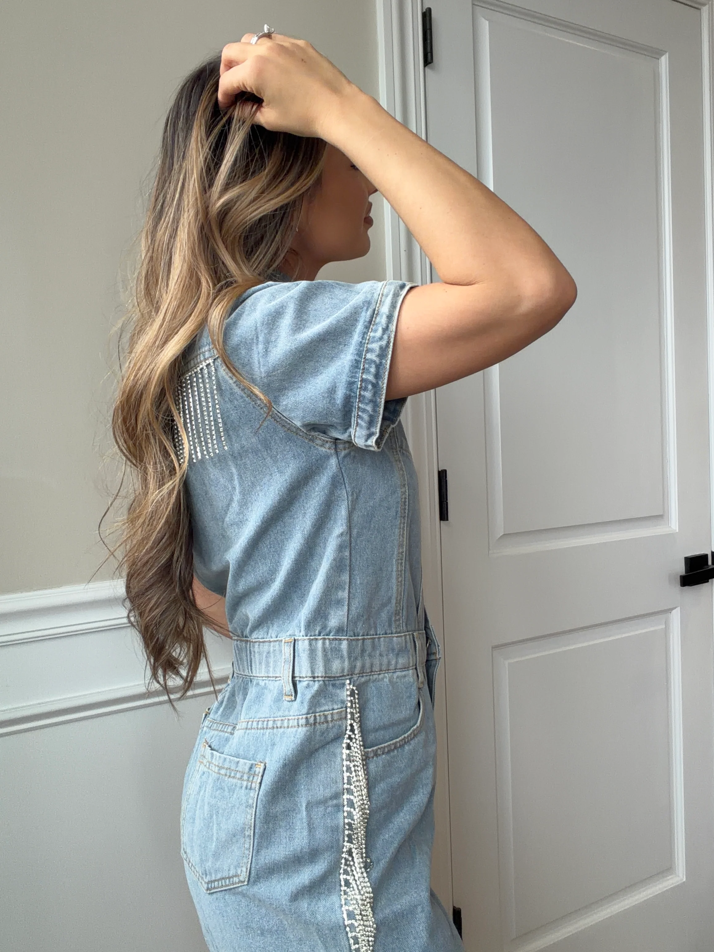 Step into the spotlight with this show-stopping denim romper that captures pure Nashville magic. Crafted from classic denim, it features eye-catching rhinestone embellishments and playful fringe detailing that catches the light with every move. Perfect for music festivals, night outs, or anyone ready to turn heads, this piece combines edgy style with just the right amount of sparkle. Whether you're dancing till midnight or making a grand entrance, this romper delivers confidence and charisma in one fabulous package.
