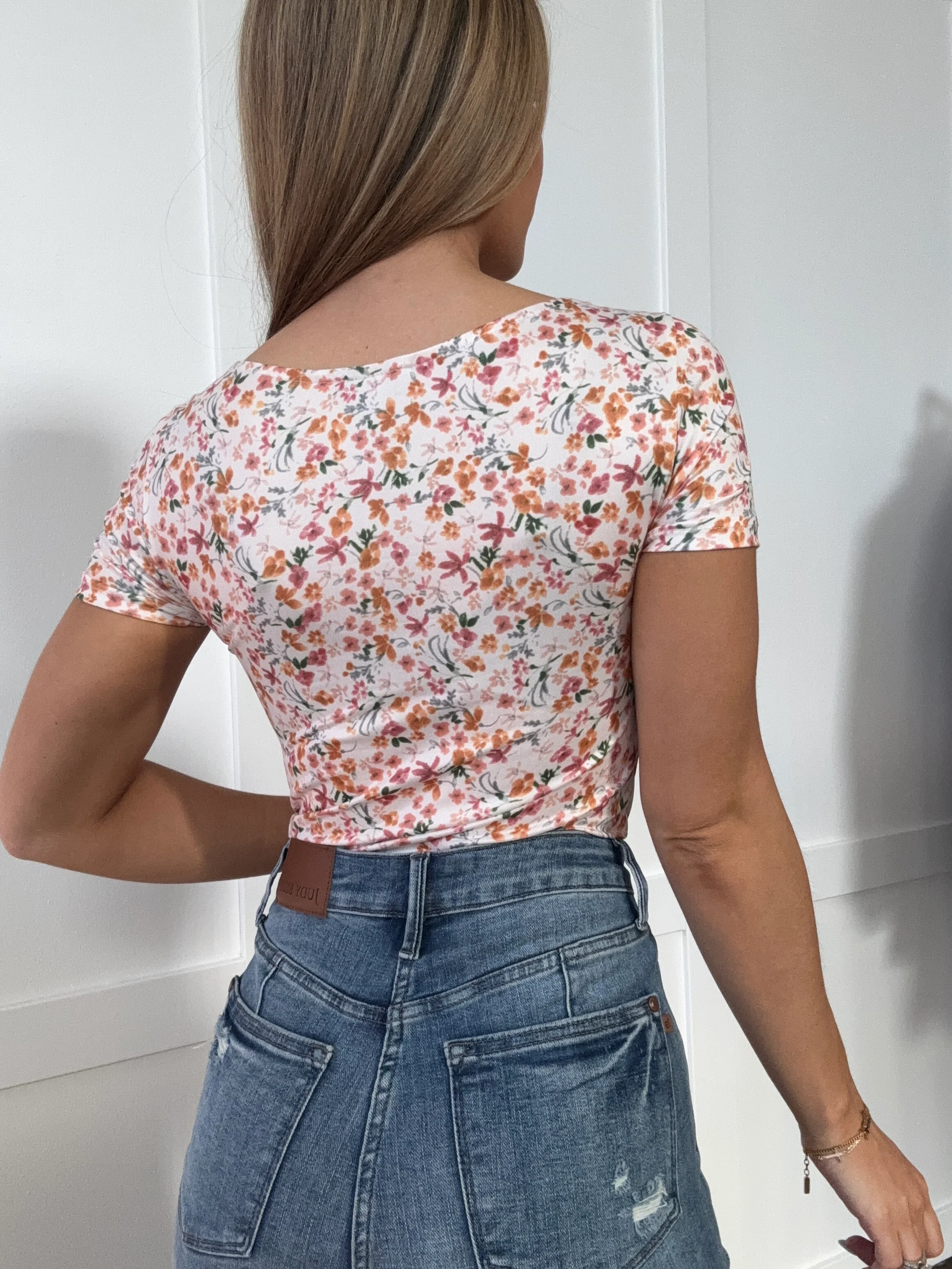 PREORDER: Izzy Ruched Short Sleeve Bodysuit with Playful Florals, Button Up and Snaps